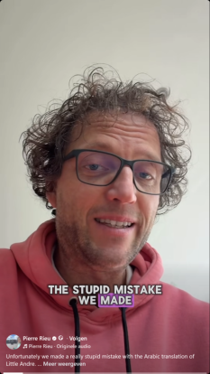 Not an April Fool's joke, but a stupid mistake: 1,000 copies of Rieu book printed incorrectly April 1, 2026, De Limburger, by Sarah De Groof The book Little André has already received multiple translations in the past: English, German, Spanish, French, and Polish. The intention was to add Arabic to that as well, but that version will have to wait a little longer for the time being, Pierre Rieu, André's son, announced this on his Instagram account. Left and right "We are not proud of our stupid mistake," Rieu begins his video. Because a thousand Arabic translations are now ending up in the trash. "We all know that the way of reading is the other way around in the Arabic language. So, we should have swapped the pages. But still, it went wrong," says Rieu’s son. "This means that 1,000 books are going into the paper shredder." Not an April Fool's joke It is not an April Fool's joke, he further explains, but it is a stupid mistake. Fortunately, there are saviors in need: for instance, Vista College has expressed interest in the incorrectly printed books. So, the Arabic version will have to wait a little longer for the time being.