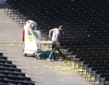 cleaning of the square after each concert day, with leaf blowers and vacuum cleaners. André makes a
