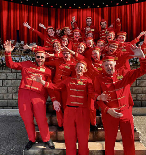 Part of the piccolo group poses on the steps of the stage,