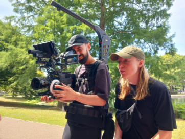 Heather Jamieson and Pierre in front of the Theater